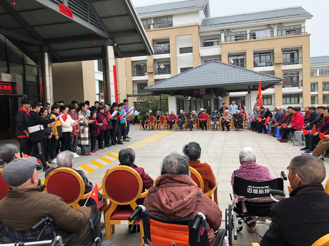 活动在下午3点开始,公司为老人们带来了特色表演。首先为老人们带来一段舞龙表演,吉祥喜庆的舞狮表演结合武术动作洋溢着青春的活力。接着志愿服务队表演了吉他演奏、歌唱《我的中国心》、《红旗飘飘》等歌曲节目以及“啦啦操”表演。在互动环节,安排了“击鼓传花”,简易健身操等节目。最后以全体师生党员与老人们合唱歌曲《我和我的祖国》结束了演出。活动现场气氛融洽,老人们喜笑颜开并频频为我们的表演报以热烈的掌声。