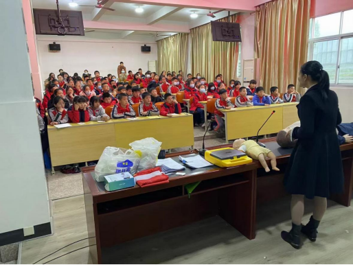 17日上午9点30分,霍童中心小学政教主任叶晓雨老师组织100多名该校师生参加了本次急救知识普及讲座和急救技能实践训练活动。在讲座现场,孙雪春副主任医师给该校师生分享“常见意外伤害的应急救护”理论知识与操作技能要领,特别强调“黄金急救4分钟”对于抢救“心脏骤停”患者的重要性,详细介绍从发现病人、评估现场是否安全、判断病人意识、快速判断病人呼吸、高声呼救、胸外按压、人工呼吸等心肺复苏流程,并演示了自动人体除颤仪AED机的使用。还特别强调像癫痫发作、晕厥、休克等意识丧等情况,但自主呼吸存在,不能实施心肺复苏,只有病人意识丧失,呼吸停止,或者是呼吸异常如叹息样呼吸时,才可实施心肺复苏。同时对气管异物、毒蛇咬伤、意外创伤、中暑等救护一一介绍,还着重介绍了小学校园最容易发生的创伤意外的现场救护,并通过互动、现场演示等方法加深师生们理解和学习的热情。讲座结束后,项目组成员还为该校师生们进行急救技能操作现场体验指导,手把手传教心肺复苏、气管异物急救、止血、包扎等技能。该校师生们学习的热情很高,积极参与演练和操作,初步了解掌握了心肺复苏等相关知识和急救技能。