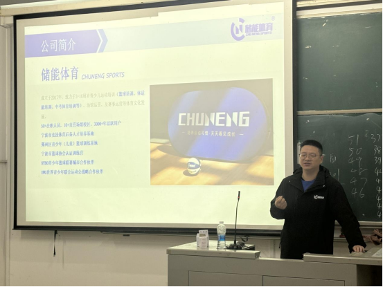 宣讲会上,储能体育的人力总监郑先生围绕公司发展历程、核心业务、人才需求及职业发展路径等内容展开介绍。该公司专注于 3-16 周岁青少儿运动培训与体育文化运营,拥有多个官方认证训练基地与赛事合作资源,目前正面向体育专业毕业生招聘教练、运营等岗位。主讲人还结合自身行业经验,分享了青少年体育教育行业的发展前景,并与在场员工就岗位技能要求、实习成长路径等问题进行互动交流。