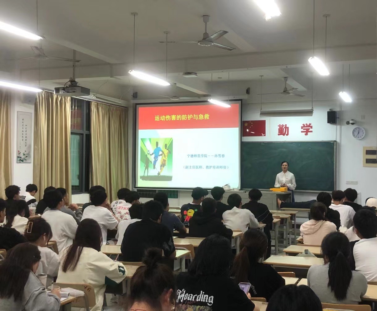 孙雪春副主任医师围绕运动伤害产生的因素、治疗原则、防护措施等展开,并巧用现场同学做示范,通过案例结合录制视频生动讲解运动诱发心脏骤停的应急救护过程。