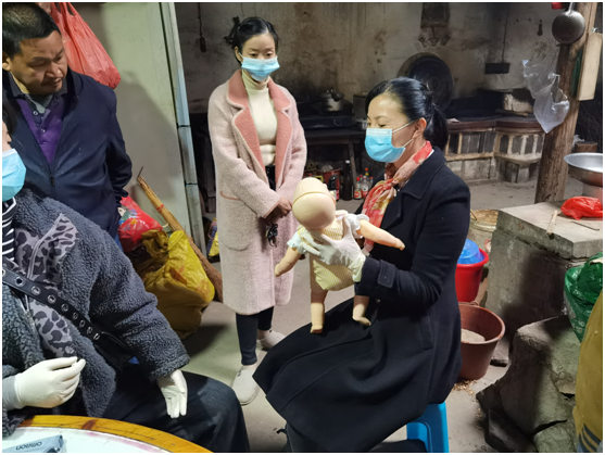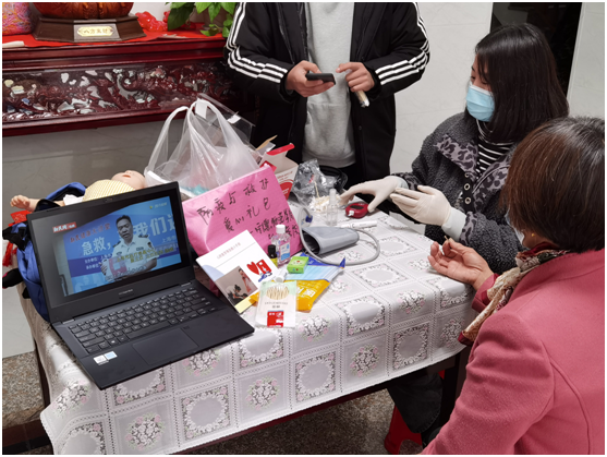 根据相关新冠疫情防控精神,为了减少聚集,项目组师生不辞辛苦,深入到村民家中,一方面为村民普及新冠疫情防护知识,包括新冠病毒感染出现的典型症状、感染途径、预防方法等,并示范正确佩戴口罩、七步洗手法,以及引导村民适当运动锻炼增强免疫力等;另一方面项目组师生为村民普及常见意外伤害应急救护知识和技能、进行急救知识问卷调查、创伤止血包扎技能指导等,特别是通过播放录制的心肺复苏急救操作视频、气管异物急救视频,手把手现场气管异物急救操作技能指导,还为村民检测血压和血糖,普及相关高血压、高血糖等预防保健知识。